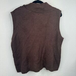Keywords: leather vest, women's fashion, fall style, casual wear, turtleneck collar, full zip, brown vest, XL size, genuine leather, Designers Studio, solid pattern, autumn wardrobe, stylish layer, pre-owned vest, women's outerwear.