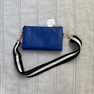 This modern crossbody bag features a bold cobalt blue color that stands out with its sleek, minimalist design. The adjustable strap is in black and white (small discoloration found on strap - see photos) and gold-toned hardware make it fun and bold.