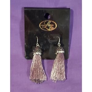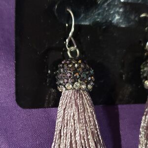 Designs By Liza Kim Purple Tassel Earrings, with Tags. These are very pretty dangle earrings by Liza Kim. The caps are covered with pavé rhinestones. Most of the rhinestones are black with a metallic coating, and the bottom rim are clear. The tassels are a purple thread. They drop just over 2 inches on silver tone metal hooks. Pre-owned and may have minor wear, still on original card and in very good condition.