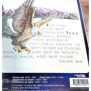 This cross stitch kit features a majestic eagle and an inspirational Bible verse. It includes pre-sorted thread, needle, and instructions for precise assembly.