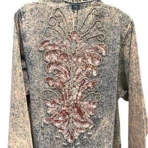 Wow! Wow! Wow! Step out in style with this unique and extremely rare vintage Designs USA denim duster! This eye-catching piece features a trendy acid wash, pink hue, beautiful embellishments, and sparkling bejeweled accents. The long silhouette adds a touch of elegance, making it perfect for layering and adding flair to any outfit. This vintage duster is sure to turn heads and become a cherished addition to your wardrobe. Get ready to make a statement with this one-of-a-kind piece! # 1625