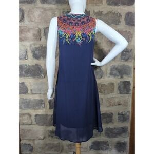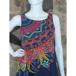 Desigual shift dress. Adri multilayer model. Blue, multicolor floral and geometric mandala print. Chiffon/knit fabric. Sleeveless. Round neck. Hi-low hem. Pullover head to wear