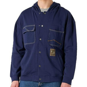 New with tags Desigual Austin sweatshirt hooded jacket in size small. Unisex. Snap front. Long sleeves. Rib knit cuffs and waistband. Four pockets. Embroidery stitch details. Blue sustainable sourced cotton.