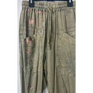 The Desigual Baggy Army Green Harem Pants XS in zip ankle style are perfect for a casual occasion with a mid-rise and pull-on closure. Made from lyocell fabric, these tapered-leg pants feature a floral pattern, pockets for convenience, and a bohemian theme. The regular fit and XS size make them ideal for wearing in the spring, summer, or fall seasons. The flat front design and machine washable care instructions add practicality to this stylish addition to any woman's wardrobe.