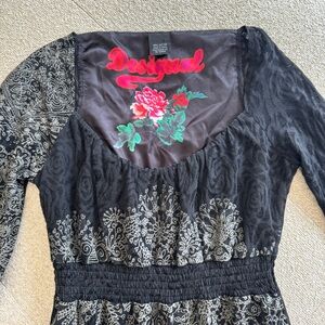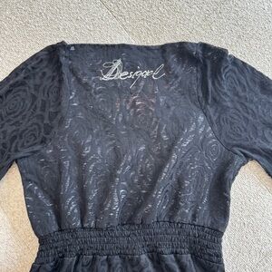 •Scoop neckline with embroidered Desigual logo and rose motif at chest; metallic script logo on back