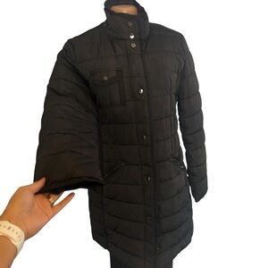 Stay warm and stylish with this elegant black quilted coat. Perfect for chilly days, this coat offers both comfort and sophistication.