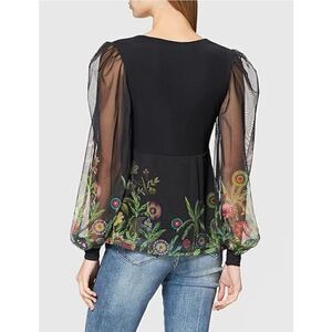 Desigual Black V-Neck Sheer Floral Overlay w/rhinestones Party Blouse XS