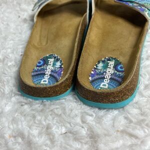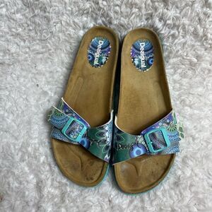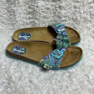 Desigual Blue,purple &.green floral strap slip on cork sandals size 9 pre owned in good used condition signs of wear on the inner and outer sole .see measurements pictures for size accuracy see all pictures any questions please message.L1