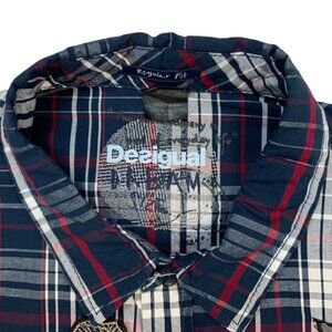Desigual Button Front Shirt L Blue Plaid Knit Long Sleeve Elbow Patch Graphics