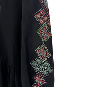 This Desigual Calendula dress is a fun and artistic piece made in Morocco, featuring a vibrant multicolor geometric embroidery print along the sleeves for a bold boho-inspired look. Designed with a tiered skirt that adds movement and a relaxed silhouette, it has a split neckline, long sleeves with button cuffs, and a breezy, flowy shape. Crafted from 100% viscose, this dress is lightweight and perfect for casual, artsy, or festival-ready styling.