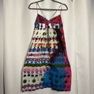 Desigual Embroidered Floral Tie Dye Boho Dress. vibrant, bohemian-style sundress with thin spaghetti straps and a flowy, A-line silhouette. The dress features a playful mix of bold patterns and colors, including polka dots, splashes of paint, and large, colorful floral prints in shades of green, red, pink, blue, and orange. Adjustable spaghetti straps that cross in the back. Gold embroidered logo on the back. Thick elastic band along the back. Size EU 42 (fits like a Medium).