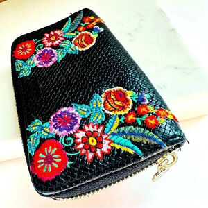 We were totally obsessed with the embroidery on Mexican blankets when we came back from Mexico. That’s why we ended up designing this black wallet, made with a woven material and embellished with symmetrical floral embroidery with Mexican inspiration. Measurements: 15 x 2 x 9 cm.