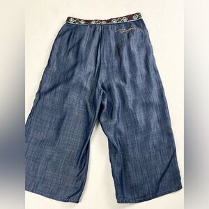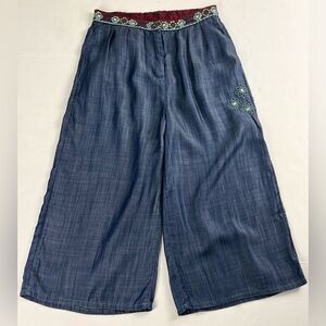 In excellent used condition Desigual Wide Leg Cropped Pants. Beautiful lightweight with a nice sheen, embroidery and sequins details and side pockets.