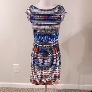 Fish and floral print. Delicate petticoat and top transparent layer with stripes. Black lining. Cap sleeves. Scoop back. 33.5” shoulder to bottom. 16.5” armpit to armpit.