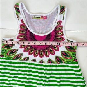 Girls cotton jersey, sleeveless dress by Desigual with varying floral and striped layers in pretty bright apple green and watermelon pink. Very comfortable to wear for party or play.