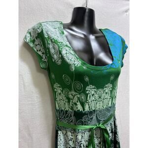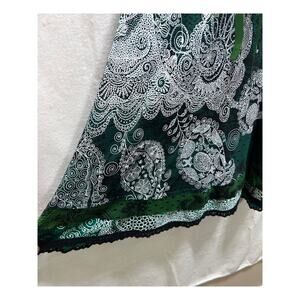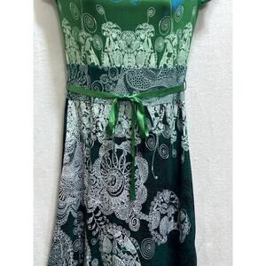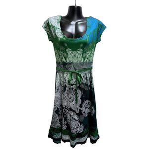 Desigual Green Paisley Print Dress M Ribbon Belt Knee Length Whimsical Boho