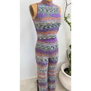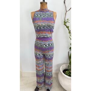 Express yourself in this Desigual sleeveless knit two-piece set, size medium. Featuring a colorful glitch-art striped pattern in purples, greens, oranges, and black, the outfit includes a mock neck crop top and wide-leg pants. Stretchy and comfortable, it’s perfect as loungewear, travel wear, or a head-turning festival outfit. A bold retro Y2K vibe makes this matching set ideal for creative styling lovers and Desigual collectors.