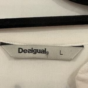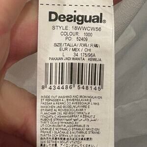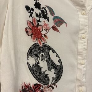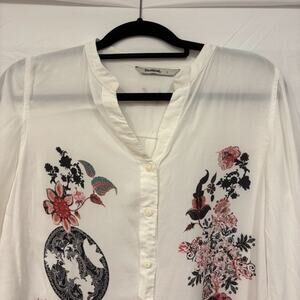 Desigual Long Sleeve Button Up Top Large White V-Necv Floral Semi Sheer