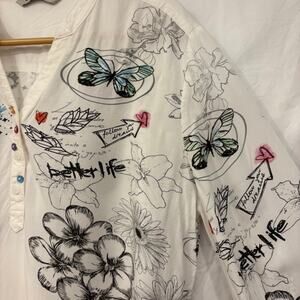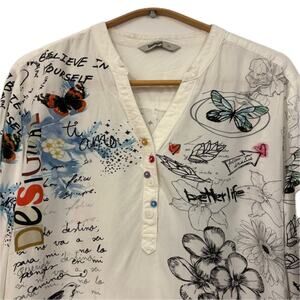 Desigual Long Sleeve Tunic Top Size XL White V-Necvk Mixed Buttons Better Life