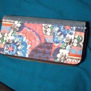 Artistic wallet with intricate patterns. Features blue, red, and green tones. Accented with decorative stones.