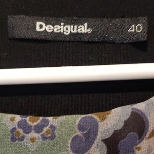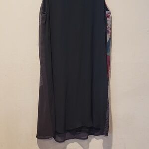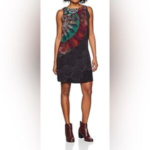 Unique dress with abstract multicolor patterns. Features shades of blue, green, and brown. Eye-catching and stylish.