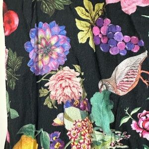 Stunning wrap style dress with kimono feel and fabulous fruit and floral print with birds on a black background.