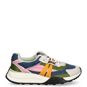 Vibrant sneakers with denim, pink, orange, and green accents. Stylish and unique design.