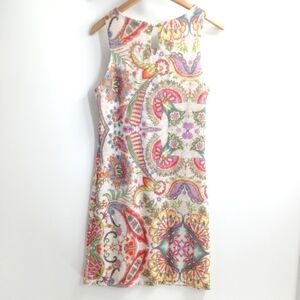 Desigual Boho Print Knit Sheath Global Traveler Dress. Fully lined, tan and cream medallion with small rhinestone embellishment, "Global Traveler" spell out in puff paint, scoop neck, pull on with a keyhole button back, sleeveless,