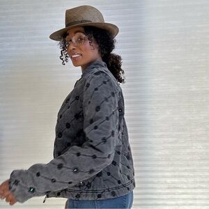 Short and fitted with subtle quilting in a dark grey washed-effect denim and black embroideries with small sequins.
