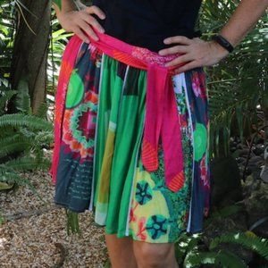 Desigual women's RARE pink/green Pakaian Jadi Wanita mini skirt. Built-in gauze slip. Mixed print in pink, green, purple, yellow and orange. Embroidered Desigual on skirt front. Removable tie belt in pink. Hidden back zipper. Purchase in Spain at the flagship store. Rare very few were made. Size 42 (10). Length 20", Waist 19" laying flat. 100% Cotton. Machine wash cold.