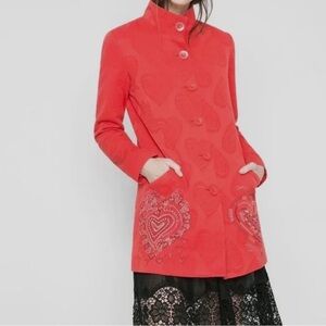 Desigual Red Heart Embroidered Jacquard Long Sleeves Peacoat, Sz Medium