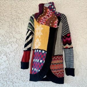 Desigual unique patchwork zip frint sweater with a shawl collar.
