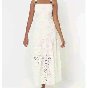 Swiss embroidery with sequins for a touch of shimmer and contrasting stripy straps. Maxi dress made from 100% cotton with a subtle A-line cut. Crew neck White Swiss embroidery Sequin details on the embroidery A-line Midi length Contrasting striped straps BCI cotton
