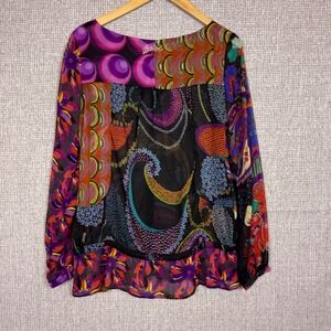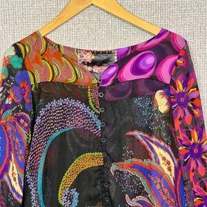 Keywords: Desigual blouse, floral print top, boho chic blouse, long sleeve blouse, multicolor blouse, sheer blouse, button down blouse, paisley print, womens top, size M, designer blouse, statement blouse, unique blouse, colorful top