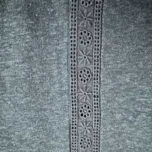Navy blue short sleeve top. Cold shoulders. Floral, peace sign and heart print on front. Crochet shoulder and sleeve details. Floral eyelet panels on front and back.