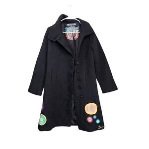Desigual Trench Coat Black Sz 42 Large Painted Circles Jacquard Button Front