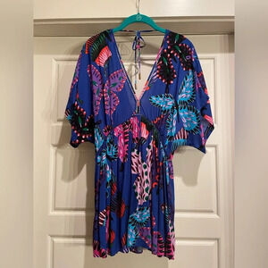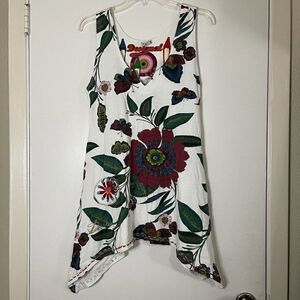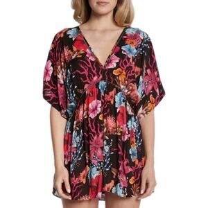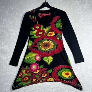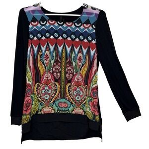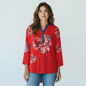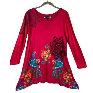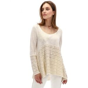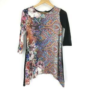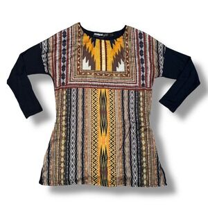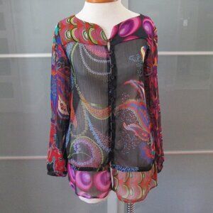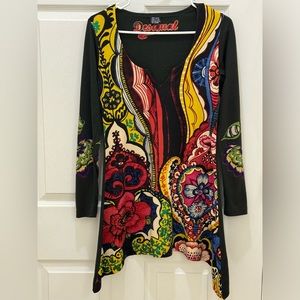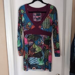 tunic in shades of maroon green and blue. Long sleeves, empire waist, deep wide boat neckline. raw, rolled hem.