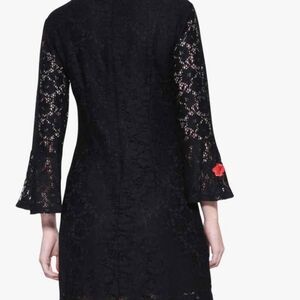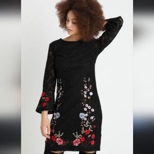 Elegant black dress with vibrant floral embroidery. Perfect for any occasion.Desigual Dress “Vermond” – spectacular black lace dress with gorgeous colourful floral embroidery and bell sleeves! Stunning fit, stretchy fabric, zipper on the back. Very feminine and exquisite style. With Lining. Polyester – Elastane. Very good condition see pics