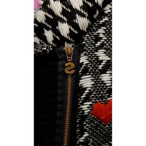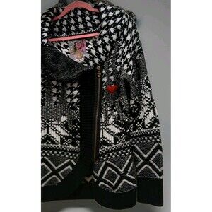 Super unique black and white mixed pattern zip sweater from Desigual. Features heart patch detail and bold graphic knit with Nordic/Fair Isle + houndstooth-style design. Total Y2K grunge streetwear vibes super flattering and so fun to style layered or zipped.