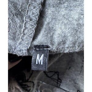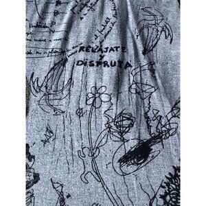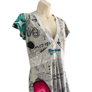 Desigual woman's V neck fit and flare dress. Dress is gray with abstract silver designs, black writing and faces and colorful turquoise and pink circles. Dress no longer has fabric content tag but I think it's made of a cotton spandex blend. Dress is a woman's size medium.