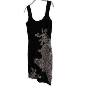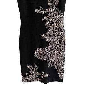 Stunning Desigual black bodycon dress featuring intricate ivory print paisley accents.