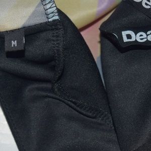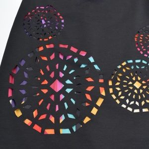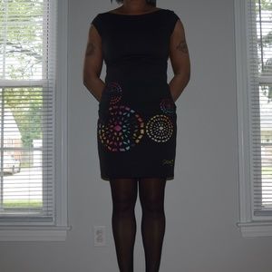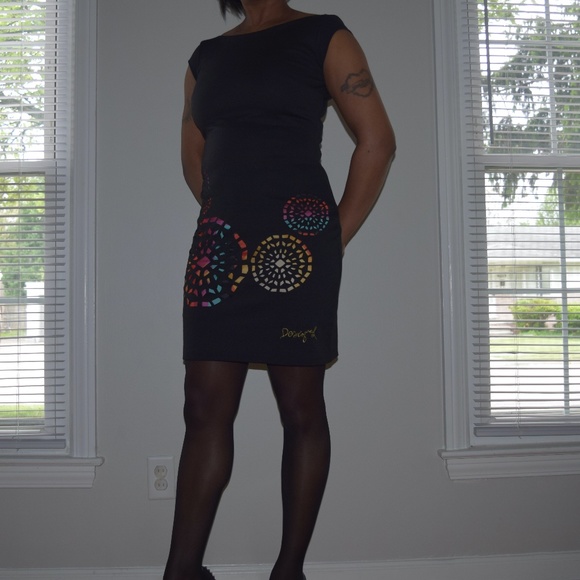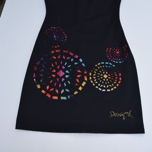 Women's Desigual Dress in Black has a fitted cut, boat neck without sleeves, backless. The colorful graphic pattern at the bottom is visible through the cut out print of the polyester dress. The Desigual logo is located at the lower left side of the dress. Although there's no tag on the dress, it has never been worn.