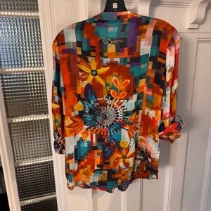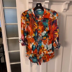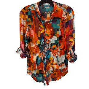 Excellent condition. Women’s Desigual button down multi color blouse. Roll tab sleeves, embroidered logo in the back of the neck. Size medium. See photos for measurements.