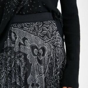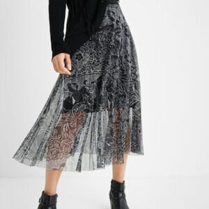 Fluid and light, the Desigual skirt offers us a pleated veil printed with black and white flowers, and an elastic waist.