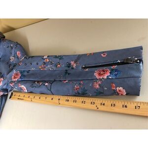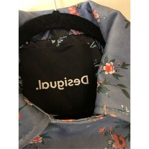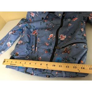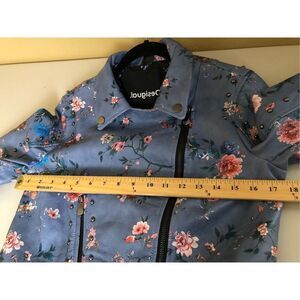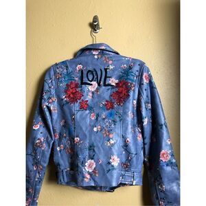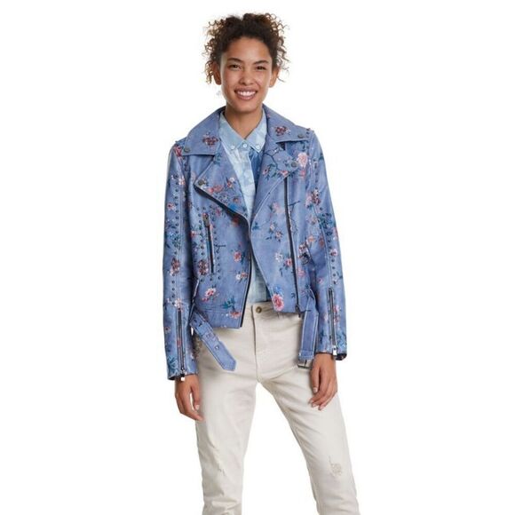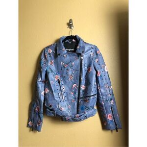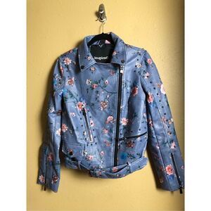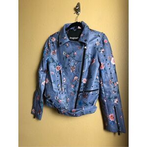 Desigual Blue Faux Leather MOTO Jacket Studded Floral Embroidery Size 36