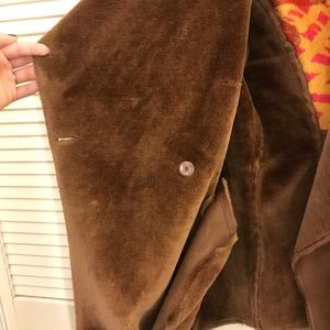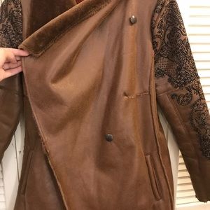 This coat is in perfect condition. Fully lined with faux fur. Very warm and cozy. Has two buttons for minimal hassle when closing. The decorative embroidery on the sleeves and back feels like some sort of velvet appliqué. Tag says size 38; it is from a company out of Spain. This size is the equivalent of a small/2.