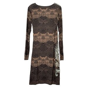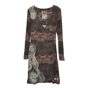 Desigual Wrap Dress Size M Brown Boho Embroidered Stretchy Floral V-Neck Bodycon