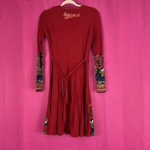 Deep red dress by Spanish designer Desigual. long sleeves with fetching patterns, tie back, and notched scoop neck. Nice amount of stretch, in a soft knit fabric. There is no size tag, but would best fit a size medium from measurements. As always, please check against your own!