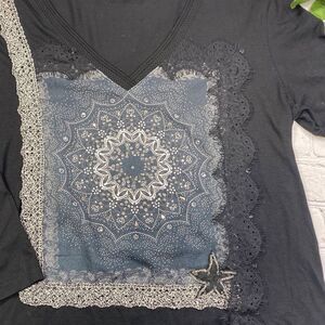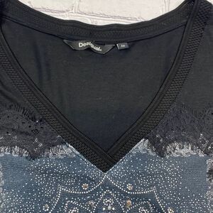 Desigual 3/4 Sleeve Ivette V-Neck Embellished Tee Top Black M