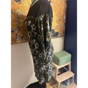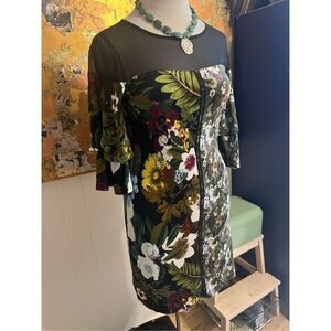 I love this mixed media dress from Desigual! This is a split screen design with different fabrics on each half and a sheer black panel on the bodice. Flared 3/4 sleeves. The patterns are beautiful florals in earthtones. You enjoy wearing this stretchy Bodycon dress everywhere! no flaws noted extra button included!